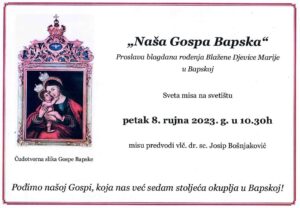 Pozivamo sve naše pripadnike i članove njihovih obitelji, te sve hrvatske branitelje da se pridruže hodočašću u čast Blažene Djevice Marije u Bapsku koje će biti u