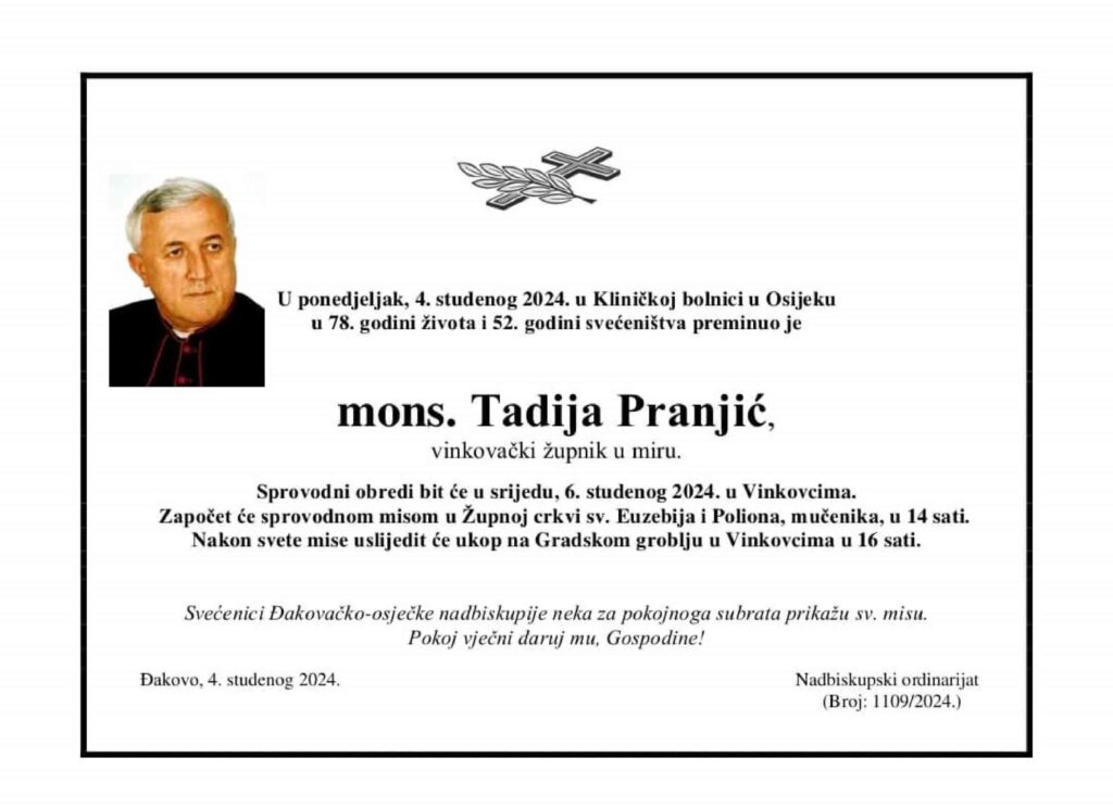 S tugom i boli u srcu javljamo svim našim članovima udruge i svim hrvatskim braniteljima da nas je u ponedjeljak 04. studenog u KBC Osijek napustio u 78. godini života i 52. godini svećeništva msgr. Tadija Pranjić.