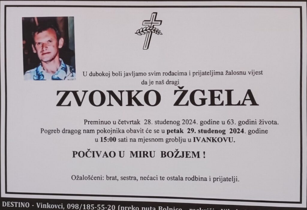 Ukop će biti u petak 29. studenog 2024. godine u 15 sati na mjesnom groblju u Ivankovu.